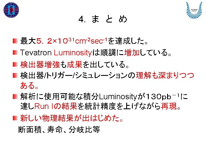 1. 2. CDF(その 2) 1 = Improved Si coverage TOF | | < 2 8 layers =2 =3 Central Drift Chamber 96 layers Time of Flight Expanded coverage Forward Calorimeter Trigger COT tracks at L 1 Silicon tracks at L 2