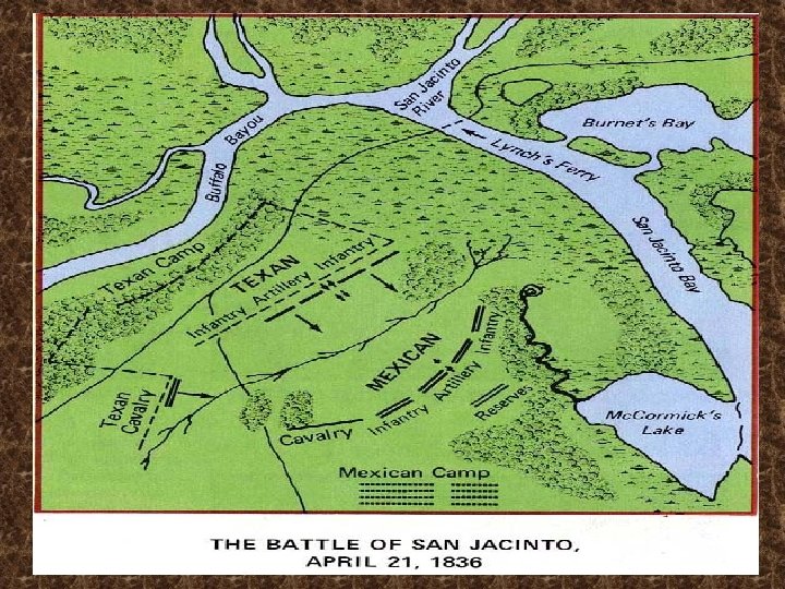 Battle of San Jacinto (April 21, 1836) · Santa Anna’s army had stopped to rest on an isolated piece of land. They were very short on food and ammunition. · Houston ordered his men to burn the bridge preventing the Mexican army from escaping. · The Texans were outnumbered, but with the memory of the Alamo and Goliad fueling them, they were determined.