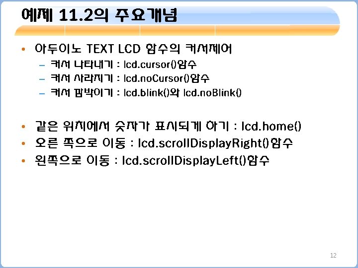 예제 11. 1의 스케치 #include <Liquid. Crystal. h> Text LCD 라이브러리 함수 사용 선언 Liquid. Crystal lcd(12, 11, 5, 4, 3, 2); LCD 연결 설정 void setup() { lcd. begin(16, 2); lcd. print("Hello, World!"); } 16칸 2줄 LCD 초기화 문자열 출력 void loop() { } 10