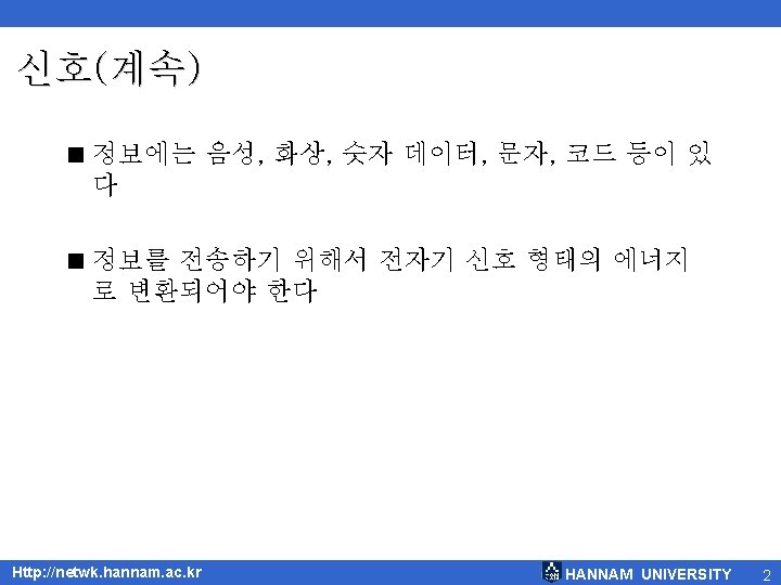 신호(계속) 정보를 신호로 변환 Text, voice, picture, etc. Digital Text, voice, picture, etc. Analog Information Http: //netwk. hannam. ac. kr Encoder Digital Analog Signal HANNAM UNIVERSITY 3