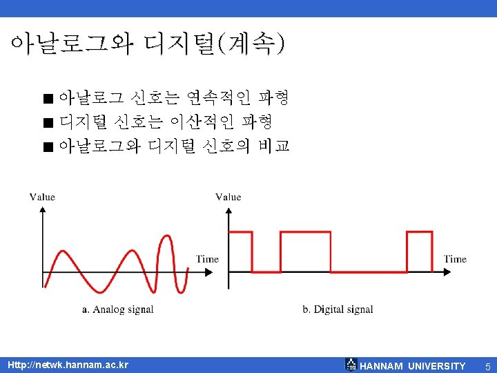 아날로그 신호(계속) < 진폭(Amplitude) Ü 신호의 높이 Ü 특정 순간의 신호 값; 전압(voltage), 전류(amperes), 전력(watts) Http: //netwk. hannam. ac. kr HANNAM UNIVERSITY 12