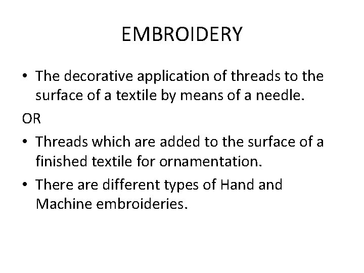 EMBROIDERY • The decorative application of threads to the surface of a textile by means of a needle. OR • Threads which are added to the surface of a finished textile for ornamentation. • There are different types of Hand Machine embroideries.