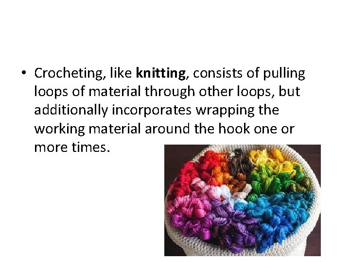 • Crocheting, like knitting, consists of pulling loops of material through other loops, but additionally incorporates wrapping the working material around the hook one or more times.