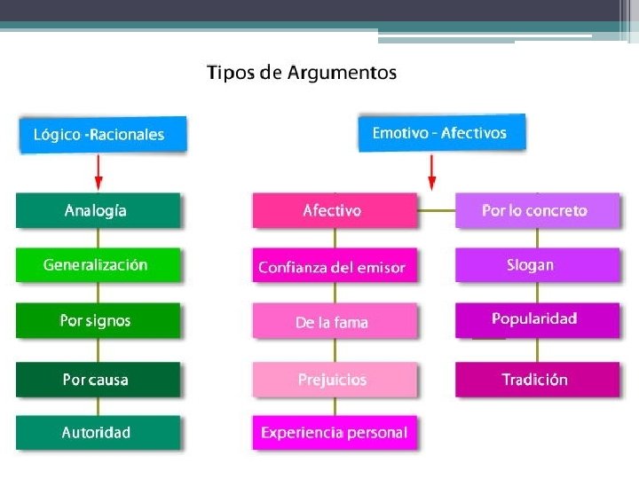 Tipos de argumentación • Todo discurso argumentativo posee distintas formas de razonamientos que permiten desarrollar el trabajo persuasivo (convencer) y que se vinculan con la tesis (opinión); dichas modalidades se diferencian considerando si el intención está puesta en lo lógico-racional o en lo emotivo–afectivo.