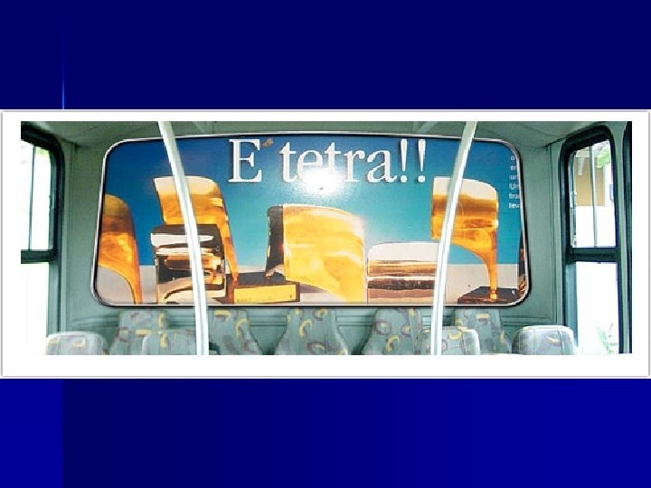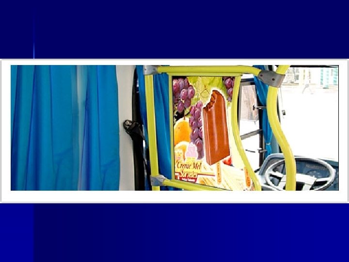 BUSDOOR INTERNO n É visualizado por cerca de 800. 000 pessoas que utilizam diariamente o sistema de transporte urbano. n É um espaço de publicidade bastante interessante do ponto de vista custo por mil. n O custo pode ser 50% menor que os outros meios de comunicação. n 73% da população utiliza o ônibus como meio de transporte.