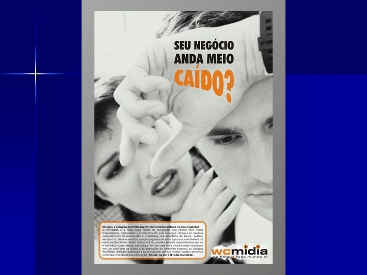 DICAS n n n sintetizar ao máximo a idéia e o conceito do produto/serviço, evitar contar histórias; não fazer uso demasiado de informações visuais. criar especificamente para o outdoor, evitando adaptações simples de outras peças criadas para a mesma campanha publicitária, pois se corre o sério risco de comprometer a eficiência da mensagem.
