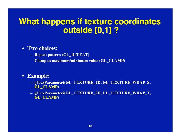 gl. Tex. Image 2 D – Arg 1 GLenum target • GL_TEXTURE_{1|2|3}D • GL_PROXY_TEXTURE_2 D – Provides queries for texture resources – Proceed with hypothetical texture use (GL won’t apply the texture) – After query, call GLGet. Tex. Level. Paramter to verify presence of required system components – Doesn’t check possibility of multiple texture interference