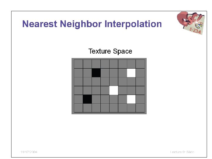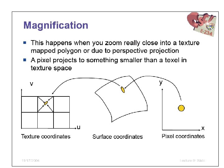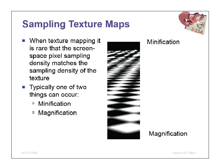Filtering Open. GL tries to pick best mipmap level Question: Which texel corresponds to a particular pixel? GL_NEAREST (Point Sampling) • Pick the texel with center nearest pixel GL_LINEAR (Bilinear Sampling) • Weighted average of 2 x 2 closest texels GL_NEAREST_MIPMAP_LINEAR • Average nearest texels from two mipmap levels GL_LINEAR_MIPMAP_LINEAR (Trilinear) • Average two averaged texels from two mipmaps