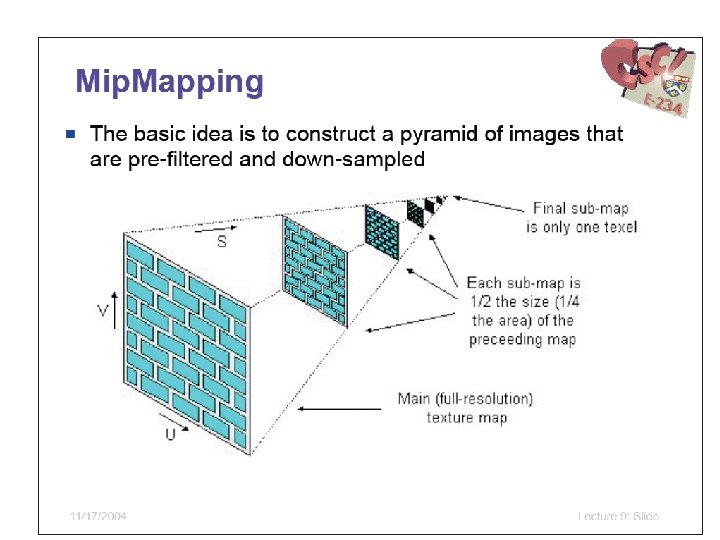 gl. Tex. Image 2 D – Arg 2 GLint level • Used for Level of Detail (LOD) • LOD stores multiple versions of texture that can be used at runtime (set of sizes) • Runtime algorithms select appropriate version of texture – Pixel size of polygon used to select best texture – Eliminates need for error-prone filtering algorithms