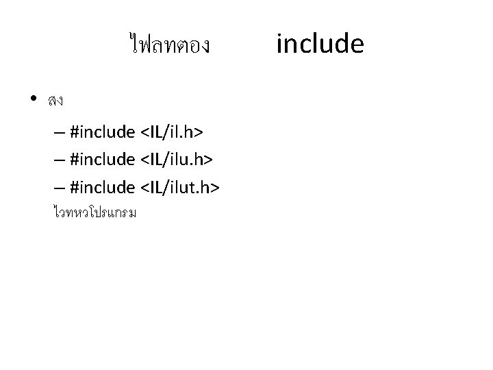 il. Convert. Image • ILboolean il. Convert. Image( ILenum Dest. Format, ILenum Dest. Type ) – ใชสำหรบแปลงขอมลรปภาพทอยในภาพท ไวเปนรปแบบอน – Dest. Format คอรปแบบสของแตละ bind pixel • IL_RGB, IL_RGBA, IL_BGRA, IL_LUMINANCE, IL_COLOUR_INDEX – Dest. Type คอชนดขอมลทใชเกบสแตละชอง • IL_BYTE, IL_UNSIGNED_BYTE, IL_SHORT , IL_UNSIGNED_SHORT, IL_INT, IL_UNSIGNED_INT, IL_FLOAT, IL_DOUBLE