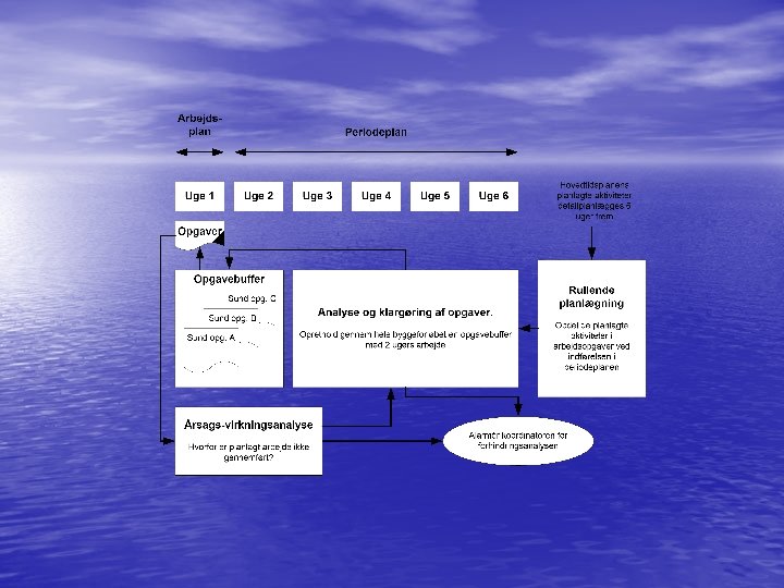 Last Planner System Tidsplan Funktion Tilknytning til LPS Masterplan/ Procesplan - kan være to planer Fungerer som overordnet aktivitetsplan for det samlede projekt fra programmering til aflevering og fastlægger projektets hovedterminer og aktiviteternes indbyrdes afhængighed. Anvendes til overordnet at konstatere om projektet er på rette spor og ikke til at styre efter. Masterplanen angiver endvidere en vurdering af det overordnede ressourceforbrug. SKAL Periodeplan Fungerer som en rullende plan med en tidshorisont på 3 -8 uger afhængigt af projektets omfang. Planen sikrer, at de arbejdsopgaver, der skal udføres i den nærmeste fremtid alle er sunde opgaver, dvs. at de kan gennemføres uden forhindringer. KAN/(MÅ) Arbejdsplan/ Ugeplan Fungerer som en plan med en tidshorisont på en uge for hvilket arbejde, der gennemføres på byggepladsen. Kun opgaver, der kan gennemføres uden forhindringer, medtages i den ugentlige arbejdsplan. VIL