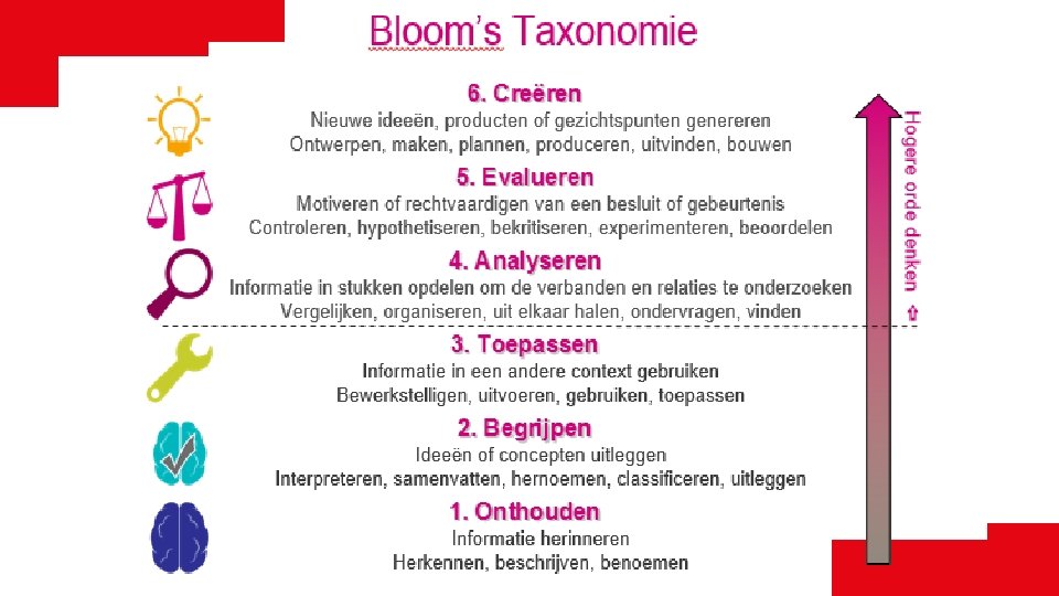 Schrijf een paar voorbeelden op… (visualiseer eerst even alle lessen die je dit jaar hebt gegeven) 1. Je les was er op gericht om leerlingen leerstof te laten onthouden 2. Je les was er op gericht om leerlingen de leerstof aan anderen te laten uitleggen 3. Je les was er op gericht om leerlingen de geleerde strategieën te laten toepassen in een nieuwe situatie 4. Je les was er op gericht om leerlingen relaties te laten ontdekken tussen verschillende onderwerpen 5. Je les was er op gericht om leerlingen een gemotiveerd oordeel te laten hebben over een aspect van de leerstof 6. Je les was er op gericht om leerlingen nieuwe ideeën te laten ontwikkelen