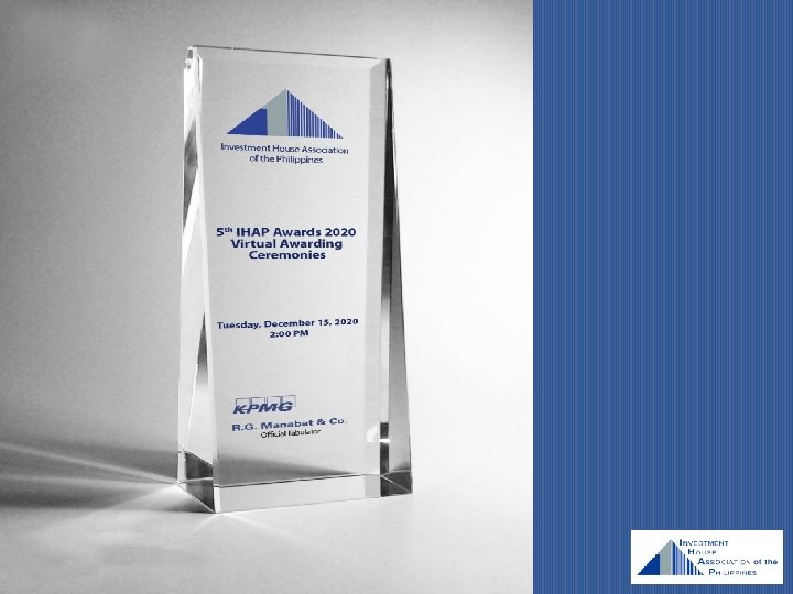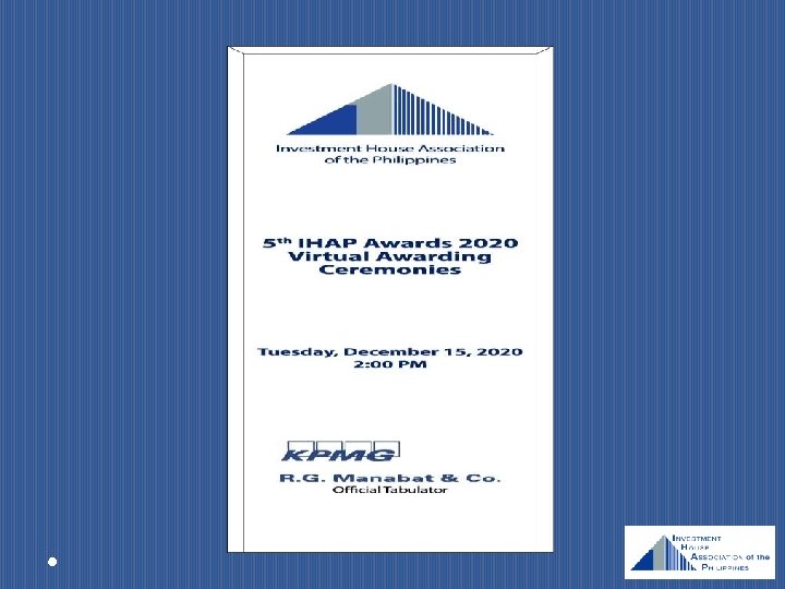 TH 5 IHAP AWARDS 2020 Virtual Awarding Ceremonies Slides: 27 Download presentation TH 5 IHAP AWARDS 2020 Virtual Awarding Ceremonies December 15, 2020 2: 00 PM WELCOME REMARKS MR. ROBERT M. LEHMANN – IHAP PRESIDENT President and CEO Amalgamated Investment Bancorporation WORDS FROM OFFICIAL TABULATOR MR. MICHAEL ARCATOMY H. GUARIN Partner and Head – Deal Advisory KPMG RG Manabat & Co. PANEL OF JUDGES Atty. Emilio B. Aquino Chairman Securities and Exchange Commission Mr. Ramon S. Monzon President and CEO Philippine Stock Exchange, Inc. Ms. Ma. Theresa B. Ravalo President Philippine Dealing System Holdings Corp. Mr. Noel S. Reyes President Fund Managers Association of the Philippines Mr. Jose Jerome R. Pascual, III President Financial Executives of the Philippines Mr. Jaime E. Ysmael President Shareholders’ Association of the Philippines Mr. Robert B. Ramos President CFA Society of the Philippines TH 5 IHAP AWARDS 2020 4780 Ortigas Avenue Extension, Pasig City, Metro Manila BEST ADVISORY DEAL Small – Mid Cap BEST EQUITY DEAL Small – Mid Cap BEST FIXED INCOME DEAL Small – Mid Cap BEST ADVISORY DEAL BEST ADVISORY HOUSE TIE BEST EQUITY DEAL BEST EQUITY HOUSE BEST FIXED INCOME DEAL TIE BEST FIXED INCOME HOUSE TIE BEST PROJECT FINANCE DEAL TIE BEST PROJECT FINANCE HOUSE DEAL OF THE YEAR INVESTMENT HOUSE OF THE YEAR