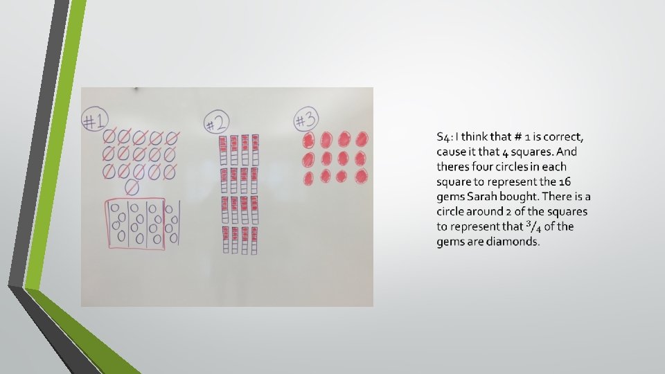T: So what, after discussing these, what can we notice about our models in the middle there? Any similarities, any differences? S 4: They’re all representing one equation? T: Are they? S 4: Yeah. S 3: That the number sentence is 2/5 times 12.