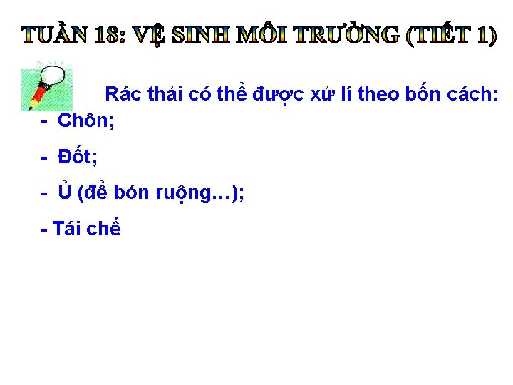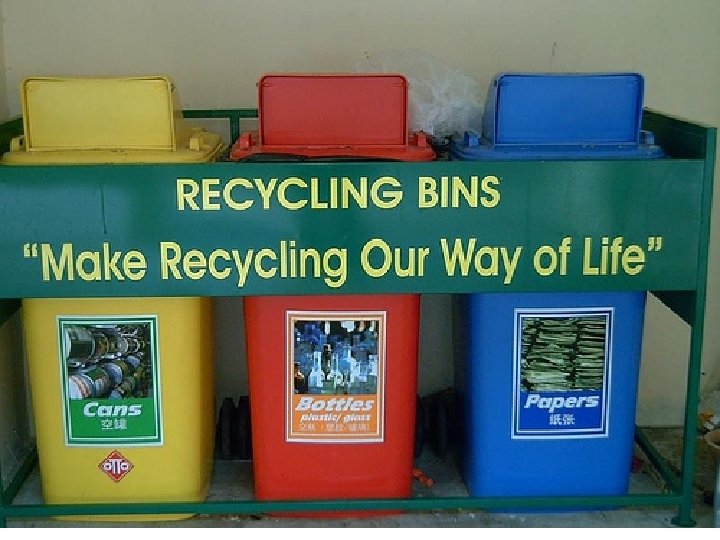 * Thùng màu xanh dùng để chứa rác có thể phân huỷ được như: thực vật, chất thải động vật, giấy… * Thùng màu đỏ dùng để chứa rác có thể tái chế được, rác không thể phân huỷ như ni lon, thuỷ tinh vỡ… * Thùng màu vàng dùng để chứa các chất độc hại, nguy hiểm, cần thu gom để xử lý riêng.