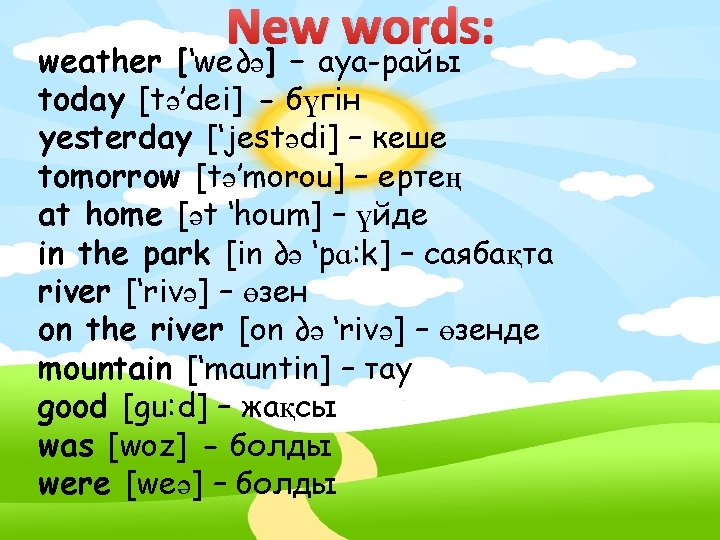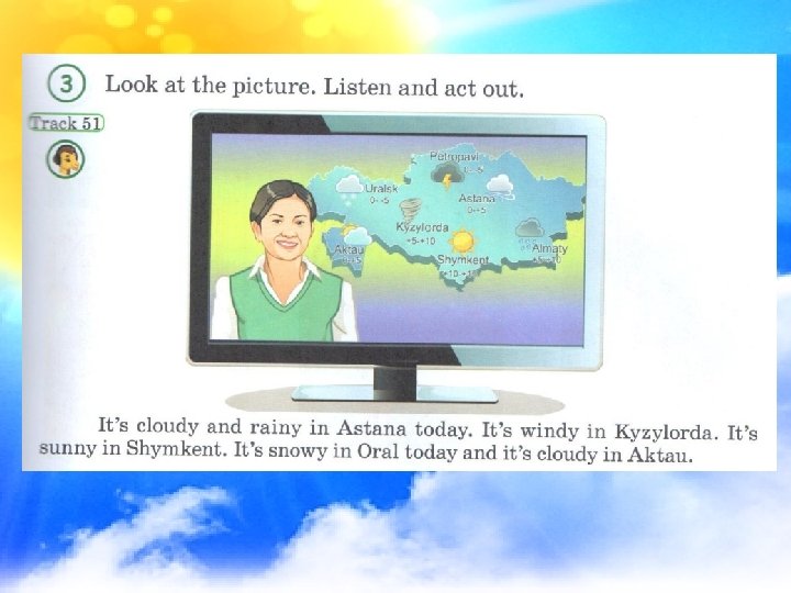 Checking-up the home task: 1. Say a poem about the weather, season or month. 2. Say the words: жаңбырлы, күн ашық, бұлтты, қар жауып тұр, жел тұрып тұр. 3. Say one sentence about the weather or a season.