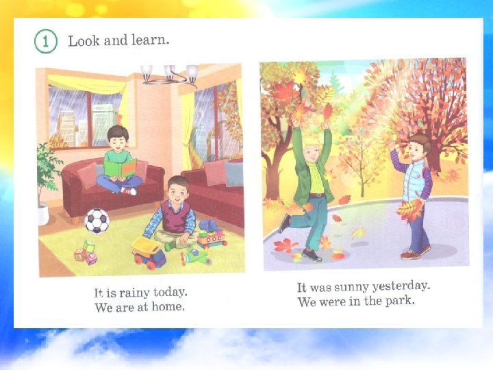 Working with cards № Sentences 1. It’s cloudy yesterday. 2. We were at home on Sunday. 3. The weather is good today. True (V) False (X) № Sentences 1. It is windy today. True (V) False(X) 2. The weather were good today. 3. It was cloudy yesterday. № Sentences 1. It is snowy in Astana today. 2. She were at home yesterday. 3. It was sunny in Aktau. True (V) № False(X) Sentences 1. They are in the museum yesterday. 2. It was windy on Thursday. 3. I was at home today.