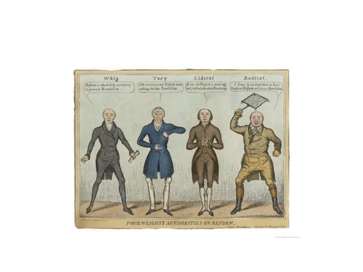 Four figures give their views on reform; • a Whig, Charles Grey (1764 -1845) says ‘Reform is absolutely necessary to prevent Revolution’; • a Tory, the Duke of Wellington (1769 -1852) says ‘I do maintain that Reform means nothing else than Revolution’; • a Liberal, possibly John Lee (1802 -74) says ‘A Leetle Reform is wanting but fiddlededee about Revolution’; • a Radical, William Cobbett (1763 -1835) brandishing a gridiron says ‘I say if we don’t have a Real Radical Reform we’ll have a Revolution’; 1831