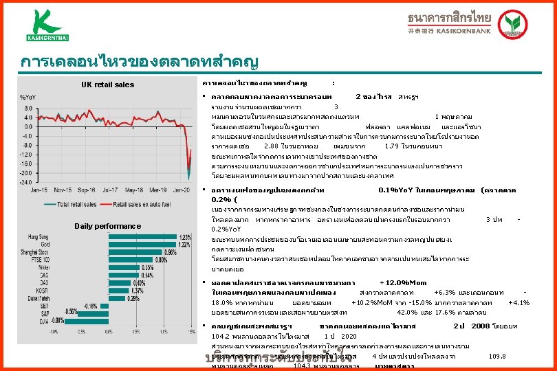 Policy Response To Covid-19: Thailand Fiscal Measures Measure I, II, and III amounting THB 1. 5 trillion (8. 9% GDP) • i) health-related spending; ii) assistance for workers (includes 3 million workers outside the social security system) at THB 5, 000 per month, farmers, and entrepreneurs affected by Covid-19; iii) support for individuals and businesses through soft loans from SFIs and Social Security Office, and tax relief; (iv) lower water and electricity bills, and lower employees’ and employers’ social security contribution; (V) lower prices of essential goods for consumers until June 30 • While part of this would be financed within the original FY 20 budget, about THB 1 trillion in additional borrowing is expected. Monetary Measures • • • Source: IMF and collected by KBank as of April 17 Reduce cost of funding: Policy rate cut by 50 bps from 1. 25% to 0. 75%; Lower the contribution from financial institutions to the FIDF from 46 bps to 23 bps of the deposit base for 2 years Help businesses: (i) BOT’s soft loans (THB 500 billion) to financial institutions to be on-lent at 2% to SMEs with outstanding (non-NPL) loans; the government covers the first 6 months of interest and guarantees up to 60 -70% of these loans; (ii) relaxation of repayment conditions for businesses (accompanied by temporary relaxation in financial sector liquidity-related regulations) including a loan payment holiday of 6 months for SMEs; and suspension of principal and reduction of interest on the debts to SFIs. Support stability in the financial sector: (i) Establish the Corporate Bond Stabilization Fund (BSF) to provide bridge financing of up to THB 400 billion to high-quality firms with bonds maturing during 2020 -2021, at higher-than-market ‘penalty’ rates; (ii) the BOT purchased government bonds in excess of THB 100 billion; (iii) BOT bond issuances were reduced or cancelled; and (iv) a special facility was set up to provide liquidity for mutual funds through commercial banks. An additional currency swap (baht-yen) between the BOT and Bank of Japan was signed on March 31.