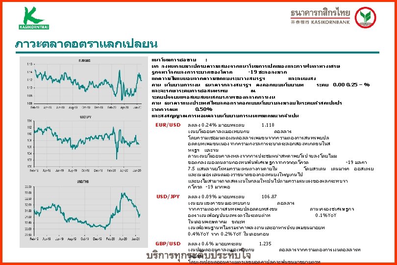 Policy Response To Covid-19: US Fiscal Measures CARES Act (USD 2. 3 tn, ~ 11% of GDP) • (i) USD 250 billion for one-time tax rebates to individuals; (ii) USD 250 billion to expand unemployment benefits; (iii) USD 24 billion for a food safety net for the most vulnerable; (iv) USD 510 billion to prevent corporate bankruptcy by providing loans, guarantees, and backstopping Fed 13(3) program; (v) USD 359 billion in forgivable SBA loans and guarantees to help retaining workers; (vi) USD 100 billion for hospitals, (vii) USD 150 billion for state and local governments and (viii) USD 49. 9 billion for international assistance Coronavirus Preparedness and Response Supplemental Appropriations Act (USD 8. 3 bn) Families First Coronavirus Response Act. Others (USD 192 billion) • (~ 1% of GDP) for: (i) Virus testing; transfers to states for Medicaid funding; development of vaccines, therapeutics, and diagnostics; support for the Centers for Disease Control and Prevention responses. (ii) 2 weeks paid sick leave; up to 3 months emergency leave for those infected (at 2/3 pay); food assistance; transfers to states to fund expanded unemployment insurance. (iii) Expansion of Small Business Administration loan subsidies. And (iv) USD 1. 25 billion in international assistance. In addition, federal student loan obligations have been suspended for 60 days. Source: IMF and collected by KBank as of April 16 Monetary Measures • • Lowered cost of funding: Lowered Fed funds rate by 150 bp to 00. 25%; Unlimited purchase of Treasury &MBS; Expanded overnight and term repos; Lowered cost of discount window lending; Reduced existing cost of swap lines and extended the maturity of FX operations; broadened dollar swap lines to more central banks; offered temporary repo facility foreigners Support the flow of credit: (i) facilitate the issuance of commercial paper (CP); (ii) provide financing to primary dealers collateralized by investment grade securities; (iii) provide loans to depository institutions to buy assets from prime money market funds (covering highly rated ABS backed CP and municipal debt); (iv) purchase new bonds and loans from companies; (v) provide liquidity for outstanding corporate bonds; (vi) enable the issuance of ABS backed by student loans, auto loans, credit-card loans, loans guaranteed by the SBA; (vii) provide liquidity to financial institutions that support SMEs to retain their workers; (viii) purchase new or expanded loans to SMEs; and (ix) purchases ST notes of state and eligible local governments.
