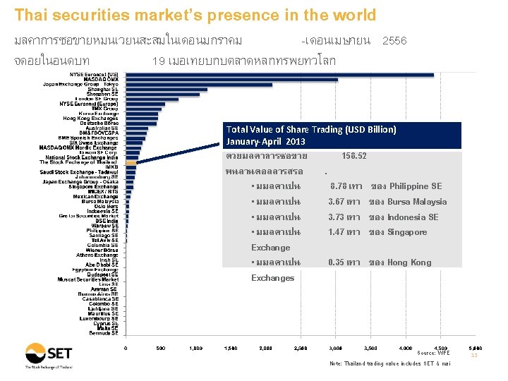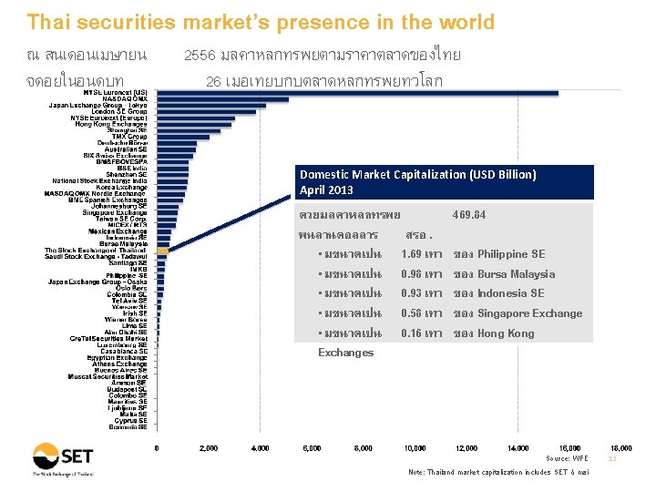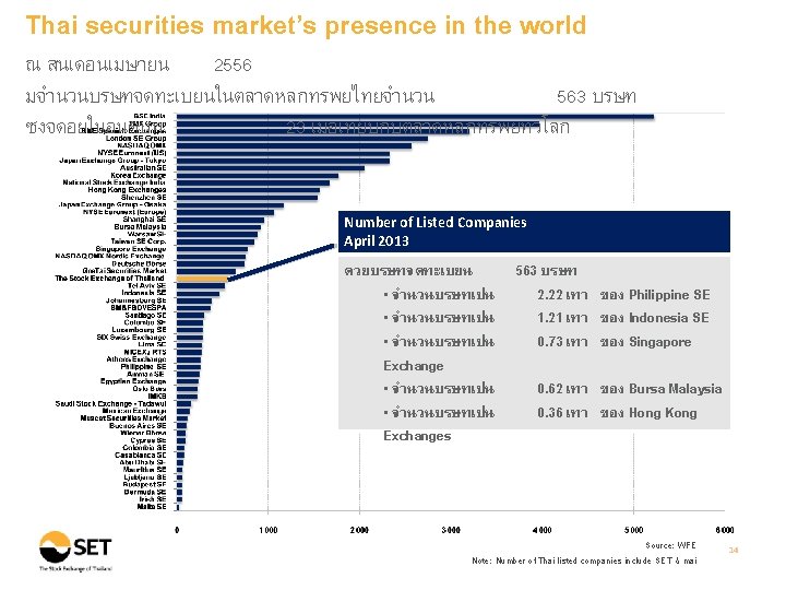 Thai securities market’s presence in Asia จำนวนบรษทจดทะเบยนในตลาดหลกทรพยไทยยงมคอนขางนอยเมอเทย บกบประเทศอนในเอเชย Number of Listed Companies : Asia Countries (As of April 2013) Source: WFE Note: Thai listed companies include both SET & mai 5