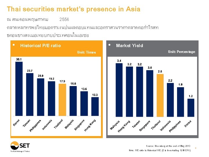 Thai securities market’s presence in Asia ผลตอบแทนรวมจากการลงทนในตลาดหลกทรพยไทย ณ สนเดอนพฤษภาคม เมอเทยบกบสนป 2543 เพมขน 13. 30 เทา สงเปนอนดบสองรองจากอนโดนเซย Total Return : Selected Asian Countries Unit: Percentage 2556 Thailand : 1, 330% May-13 Note: Total return is calculated based on the changes in the main securities price index plus reinvested dividends of each market. All returns are converted into USD basis for comparison purpose. The percentage of total return is the comparison of current value to its value at end December 2000. Source: Bloomberg at the end of May 2013 8