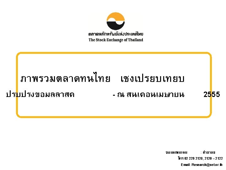 ผลตอบแทนรวมจากการลงทนในตลาดหลกทรพยไทย ณ สนเดอนเมษายน 2555 เมอเทยบกบสนป 2543 เพมขน 9. 76 เทา สงเปนอนดบสองรองจากอนโดนเซย Total Return : Selected Asian Countries Percentage Thailand : 976% Apr-12 Note: Total return is calculated based on the changes in the main securities price index plus reinvested dividends of each market. All returns are converted into USD basis for comparison purpose. The percentage of total return is the comparison of current value to its value at end December 2000. Source: Bloomberg at the end of April 2012