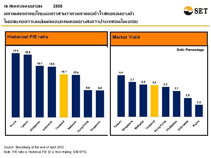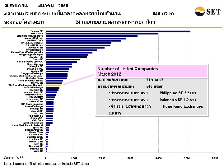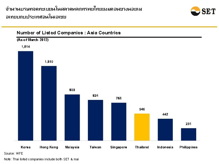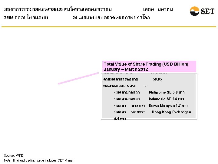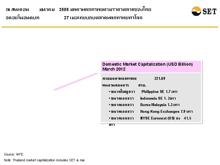 ในเดอนมนาคม 2555 ตลาดหลกทรพยไทยยงมขนาดคอนขางเลก แตมสภาพคลองสงเมอเทยบกบตลาดหลกทรพยในภมภาคเอเชย Market Capitalization* Share Turnover Velocity** Unit: Billion USD Unit: Percentage Source: WFE Note: * Market Capitalization at the end of March 2012. ** Share Turnover Velocity is calculated by {Share Turnover (of March 2012)/Market Capitalization (at the end of March 2012)}*12 Please note that the March 2012 share turnover velocity of Indonesia SE is not available so it is calculated given the market capitalization and the share turnover figures of March 2012.