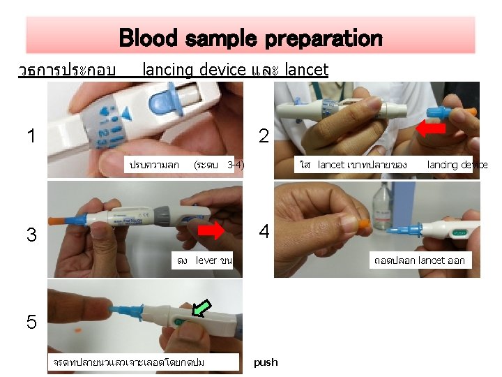 Blood sample preparation Subject 1 �� /���� 1. ������������� lancing device ����� capillary tube lancet lancing device อปกรณทใช - lancing device และ lancet - Capillary tube (hematocrit tube) 2 หลอด - Eppendorf tube - ถงมอ - สำลแหง - 70% alcohol - ททงขยะ