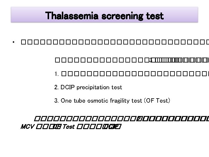 Thalassemia screening test 2. One tube osmotic fragility test (OF Test) : ����� Positive • • • ����� thalassemia ��� homozygous Hb E ���� 100% β-thalassemia trait ���� 90% α-thalassemia 1 trait ���� 93% ��������������� ������������� False Positive ���������� 5%