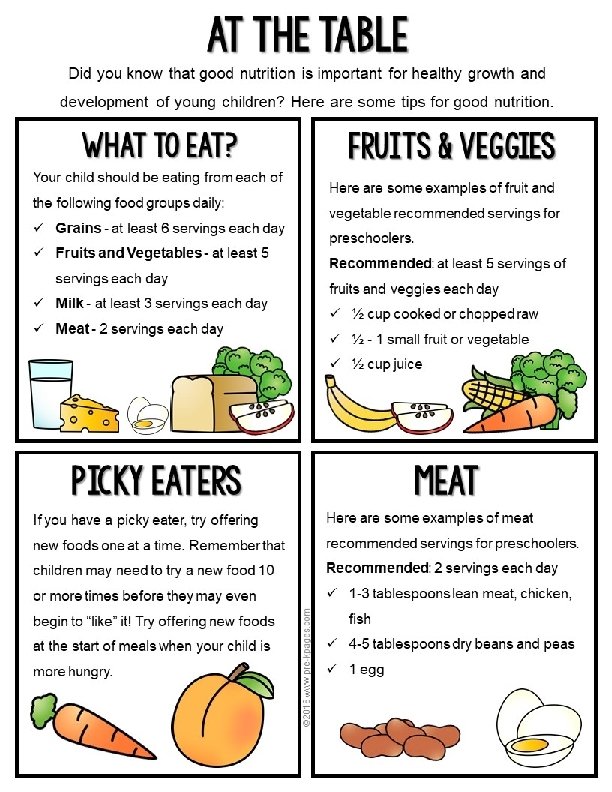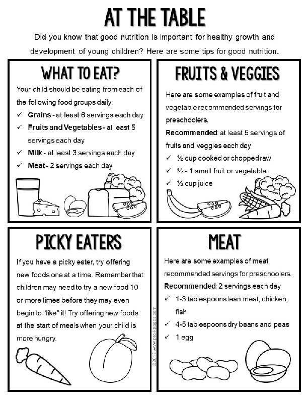 type your own title here Did you know that good nutrition is important for healthy growth and development of young children? Here are some tips for good nutrition. type title here Your child should be eating from each of the following food groups daily: ü Grains - at least 6 servings each day ü Fruits and Vegetables - at least 5 servings each day ü Milk - at least 3 servings each day ü Meat - 2 servings each day Here are some examples of fruit and vegetable recommended servings for preschoolers. Recommended: at least 5 servings of fruits and veggies each day ü ½ cup cooked or chopped raw ü ½ - 1 small fruit or vegetable ü ½ cup juice type title here If you have a picky eater, try offering Here are some examples of meat new foods one at a time. Remember that recommended servings for preschoolers. children may need to try a new food 10 Recommended: 2 servings each day or more times before they may even ü 1 -3 tablespoons lean meat, chicken, begin to “like” it! Try offering new foods fish at the start of meals when your child is ü 4 -5 tablespoons dry beans and peas more hungry. ü 1 egg
