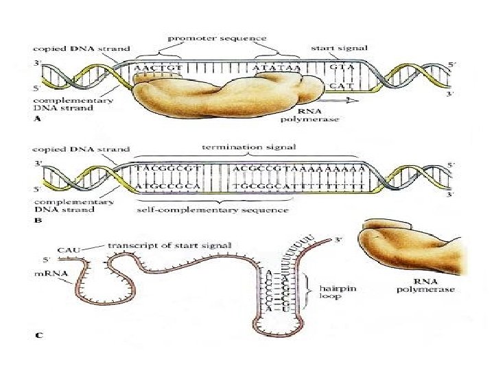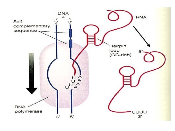 3. Termination stage… In prokaryotes can be rho-independent or rho-dependent 1 - Rho-independent transcription termination: Intrinsic termination (also called Rho-independent termination) is a mechanism in prokaryotes that causes RNA transcription to be stopped without the aid of rho protein. When Transcription process reached a region called terminator or attenuator (a Palindrome region of DNA) this will causes the formation of a "hairpin" structure from the RNA transcription looping and binding upon itself. This hairpin structure is often rich in G-C base-pairs, making it more stable than the DNA-RNA hybrid itself. So In this mechanism, the m. RNA contains a sequence that can base pair with itself to form a stem-loop structure (7 -20 repated CG thus RNA here will be double stranded)These bases form three hydrogen bonds between each otherefore are particularly strong.