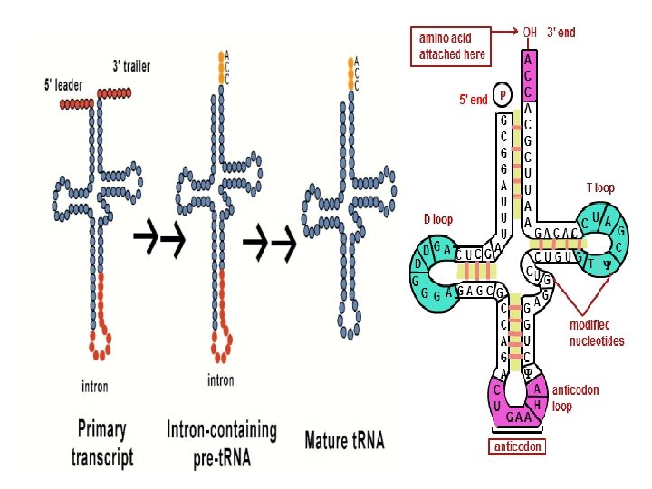 For t. RNA molecules , post transcriptional events include modification of some nitrogen base like pseudouridin and thymine, but it is more complicated in Eukaryotic cell which involve 1 -removel of leader sequence from 5 end 2 -replcament of nts at 3 end with CCA 3 OH (Acceptor arm) 3 - chemical modification of some nitrogen base 4 - Excision of intron region ,