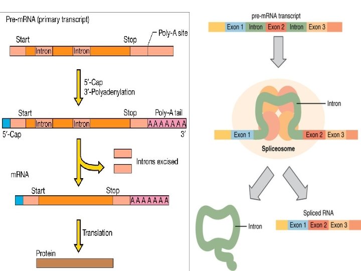 3 - Pre-m. RNA Splicing (Introns are removed from the pre-m. RNA before protein synthesis): Eukaryotic genes are composed of exons, which correspond to protein-coding sequences (ex-on signifies that they are expressed), and intervening sequences called introns (non expressed sequence) which may be involved in gene regulation, but are removed from the pre-m. RNA during processing. Intron sequences in m. RNA do not encode functional proteins All introns in a pre-m. RNA must be completely and precisely removed before protein synthesis: . 1 -The first cleavage occur by Splicesome machine at 5 end of the intron region rich with GU residue. f 2 -Then the intron bend back to form lariat structure via 5 3 phosphodiester bond 3 - cleavage at 3 end of the intron to completely released 4 - joining the exons by ligase enzyme to give arise to mature m. RNA