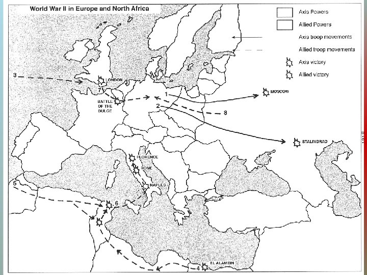 THE 2 SIDES The Axis The Allies VS. Japan Tojo Italy Mussolini France De Gaulle America FDR Britain Churchill Germany Hitler Soviet Union Stalin