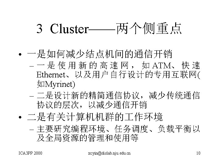 1 概 述 • 收到来自 15个国家的127篇文章 • 每篇文章经至少 3人审阅 • 录用 60篇 (+4,Special session on High-Performance Data Management +9,poster papers) ICA 3 PP 2000 xcyin@dislab. nju. edu. cn 3