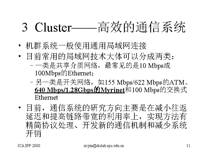 A Reduced Communication Protocol for Network of Workstations Weimin Zheng et al • FMP(fast message passing protocol) • 关键技术 – 缓冲区管理 – DMA – 避免死锁 – 局部通信 ICA 3 PP 2000 xcyin@dislab. nju. edu. cn 19