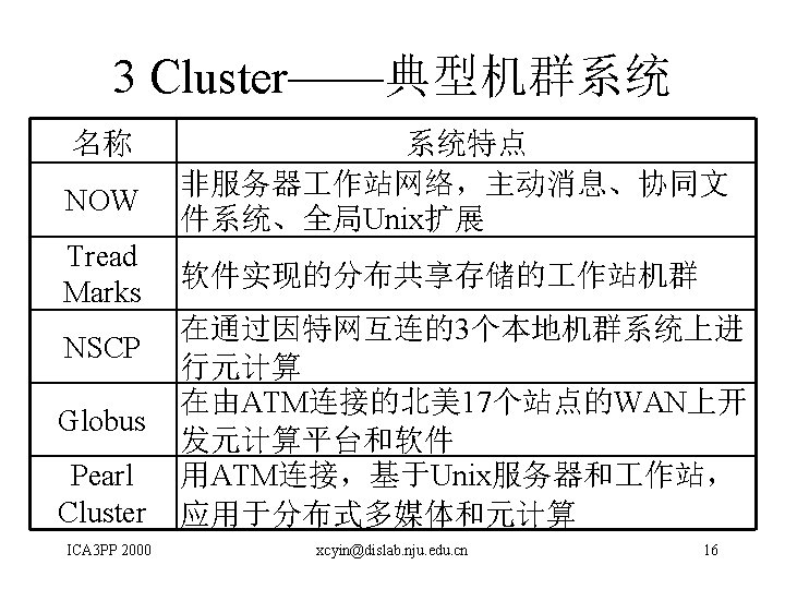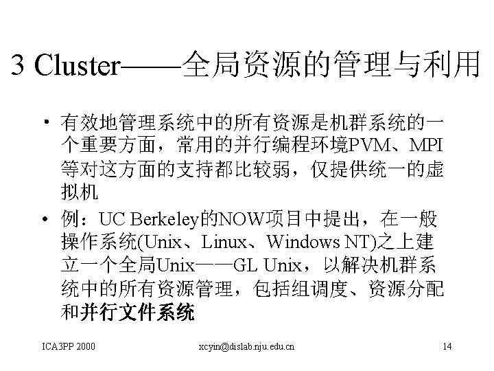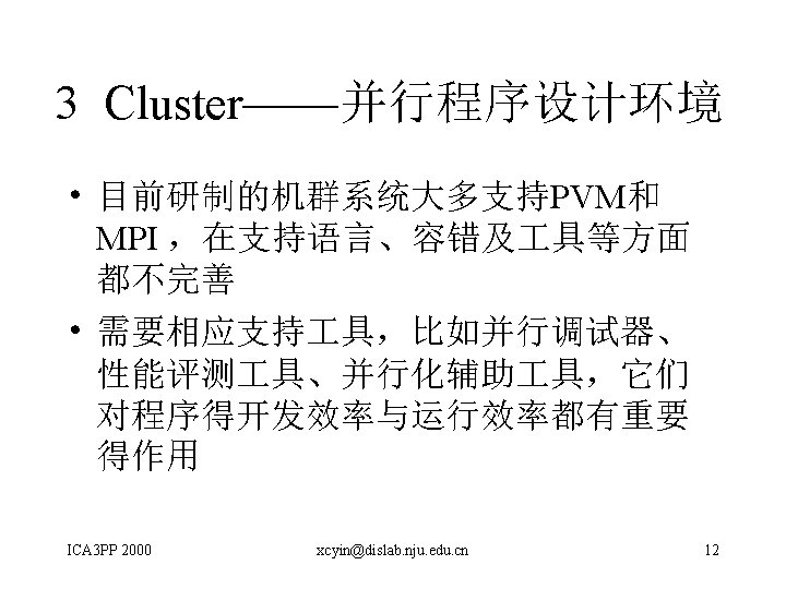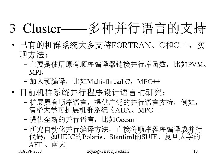A Software Development Methodology to Support Distributed Computing Clusters David Levine et al (USA) • PARSA(Prism Parallel Technologies, Inc研制的 软件开发环境) • 本文提出对PARSA的改进,以使其适合于利用 标准程序设计语言和库来开发分布式机群软件 ICA 3 PP 2000 xcyin@dislab. nju. edu. cn 20