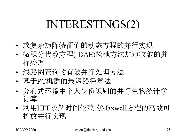1 概述(续)——主题 • Architectures, Algorithms and Networks – Parallel Architectures and Parallel I/O Systems – Interconnection Networks and Routing – Parallel Algorithms – Distributed Scheduling and Load Balancing • Systems and Applications ICA 3 PP 2000 xcyin@dislab. nju. edu. cn 4