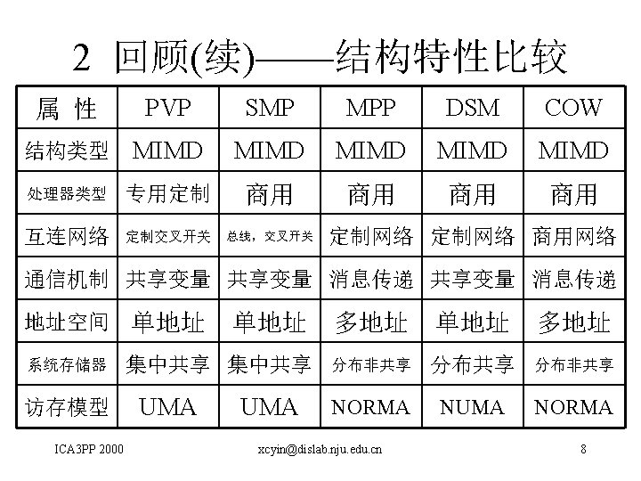 2 回顾—— 并行与分布计算技术的发展 • PVP(或VPP):Cray YMP 90、NEX SX 3、Fujitsu VP 2000 等; • SMP:SGI Power Challenge、Sun SPARC Center 2000、 曙光1号等; • MPP:Intel Paragon、IBM SP 2、Cray T 3 D、曙光1000、 曙光2000等; • DSM:Sequent的NUMA-Q、HP的SPP、SGI的Origin系列 • Clusters • Computational Grid • Meta computing ICA 3 PP 2000 xcyin@dislab. nju. edu. cn 7