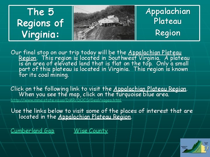 The 5 Regions of Virginia: Appalachian Plateau Region Our final stop on our trip today will be the Appalachian Plateau Region. This region is located in Southwest Virginia. A plateau is an area of elevated land that is flat on the top. Only a small part of this plateau is located in Virginia. This region is known for its coal mining. Click on the following link to visit the Appalachian Plateau Region. When you see the map, click on the turquoise blue area. http: //www. mme. state. va. us/DMR/DOCS/Geol/vageo. html Use the links below to visit some of the places of interest that are located in the Appalachian Plateau Region. Cumberland Gap Wise County