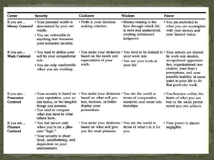 Other centers �There are plenty of other centers besides money. These include � Possession centered – prestige, happiness, and decision making abilities all come from personal possessions – clothing, vehicles, etc. � Pleasure centered – satisfaction is based on individual “highs”. All decisions, money making, and relationships are based on obtaining highs � Social centered – these people will become anyone and do anything to be accepted by others � Work/School centered – studying or a career are the only things that matter