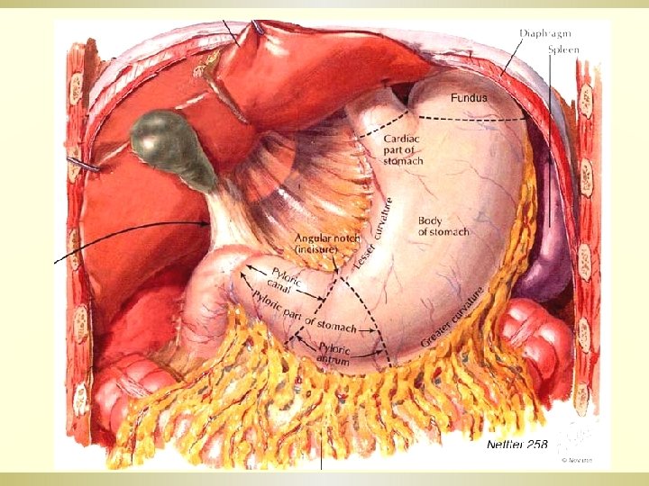 Nerve supply of stomach ß Parasympathetic innervation The left vagus N→The anterior vagal trunk → anterior gastric hepatic branches Þ Þ Þ ß The right vagus N → The posterior vagal trunk → posterior gastric celiac branches “crow’s foot” → supply the pyloric part Sympathetic innervation Þ Þ Mainly from celiac plexus Afferent and efferent fibers derives from thoracic segments (T 5 -L 1)