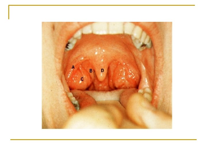 Palate 腭 n Two parts q Hard palate 硬腭: anterior 2/3, formed by the maxilla and palatine bone Soft palate 软腭: posterior 1/3 n n n Velum palatinum 腭帆 Uvula 腭垂 Palatoglossal arch 腭舌弓 Palatopharyngeal arch 腭咽弓 Isthmus of fauces 咽峡 formed by uvula, free border of velum palatinum, both side of palatoglossal arches, and root of tongue.