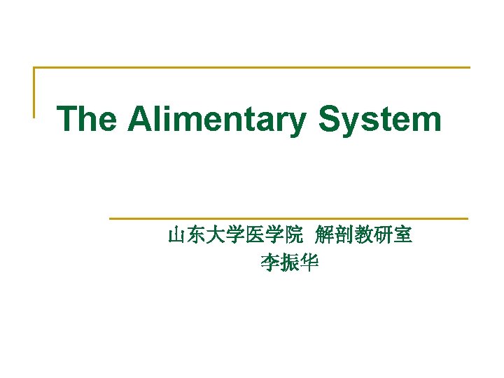 Composition Alimentary canal消化管 n n Mouth 口腔 Pharynx 咽 Esophagus 食管 Stomach 胃 Duodenum 十二指肠 n Small intestine小肠 Jejunum 空肠 Ileum 回肠 n Large intestine 大肠 Superior alimentary canal 上消化道 Inferior alimentary canal 下消化道 Alimentary glands 消化腺 n n n Major salivary glands 大唾液腺 Liver 肝 Pancreas 胰 Function: ingestion, digestion, absorption, egesting