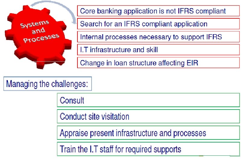 Tax System Effect/ Tax Reporting § Tax considerations associated with the conversion to IFRS are complex. § IFRS conversion normally calls for a detailed review of tax laws and tax administration. § Specific taxation rules would have to be redefined to accommodate these adjustments. – e. g. , loss relief period may need to be reviewed because transition adjustments may result in huge losses that may not be recoverable within the allowed periods. § Accounting issues that may present significant tax burden on adoption of IFRS, include determination of Impairment, Loan loss provisioning and Investment in Financial Instruments.
