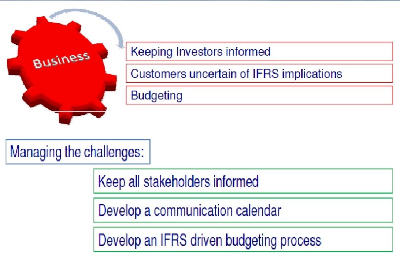 Anticipating the challenge to solve it faster l l l Key decision makers to adopt principles Availability of IFRS technical resources Cost of bridging gaps in knowledge –budget constraints Organization wide training in IFRS principles relevant to entity IFRS 1 may also require going back in time to evaluate impact – unless record retention is reasonably effective just gathering information could be a challenge Applying fair values to accounting