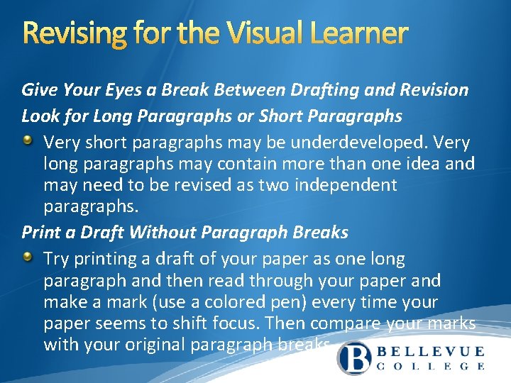 Revising for the Visual Learner Give Your Eyes a Break Between Drafting and Revision Look for Long Paragraphs or Short Paragraphs Very short paragraphs may be underdeveloped. Very long paragraphs may contain more than one idea and may need to be revised as two independent paragraphs. Print a Draft Without Paragraph Breaks Try printing a draft of your paper as one long paragraph and then read through your paper and make a mark (use a colored pen) every time your paper seems to shift focus. Then compare your marks with your original paragraph breaks.