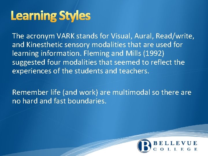 The acronym VARK stands for Visual, Aural, Read/write, and Kinesthetic sensory modalities that are used for learning information. Fleming and Mills (1992) suggested four modalities that seemed to reflect the experiences of the students and teachers. Remember life (and work) are multimodal so there are no hard and fast boundaries.