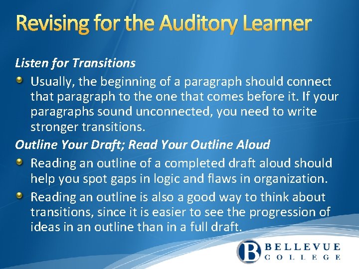 Revising for the Auditory Learner Listen for Transitions Usually, the beginning of a paragraph should connect that paragraph to the one that comes before it. If your paragraphs sound unconnected, you need to write stronger transitions. Outline Your Draft; Read Your Outline Aloud Reading an outline of a completed draft aloud should help you spot gaps in logic and flaws in organization. Reading an outline is also a good way to think about transitions, since it is easier to see the progression of ideas in an outline than in a full draft.